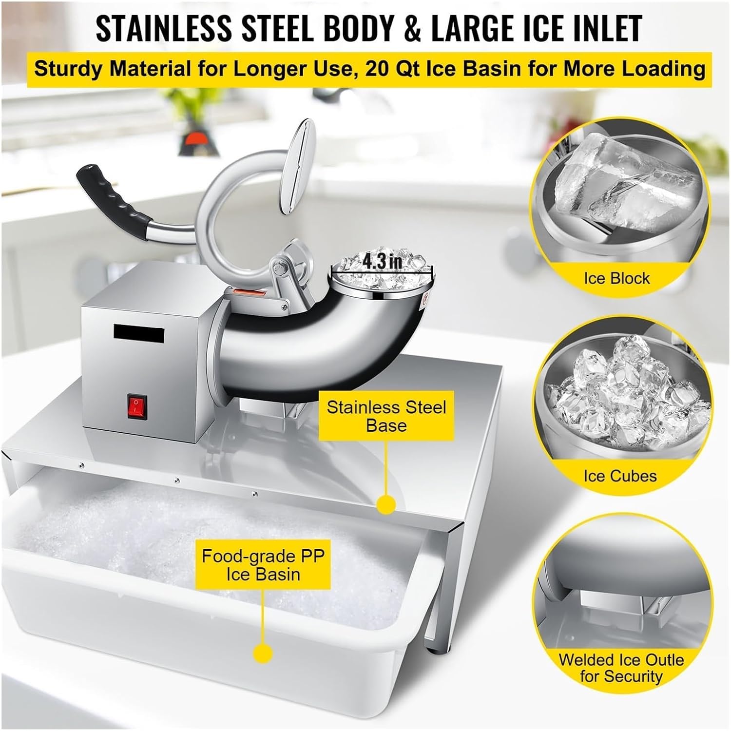 - ▶An extra-large ice basin is also offered, 18.3″x13.0″x5.5″ (46.5x33x14 cm) in inner dimensions and 21.5 Qt (20 L) in capacity, which is large enough for holding the falling crushed ice. The ice outlet is firmly welded to the base for security concerns, avoiding the ice snow splash everywhere.